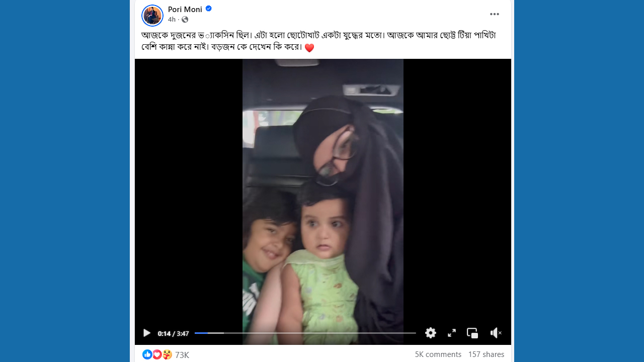 ক্যাপশনে পরী লিখেছেন, ‘আজকে দুজনের ভ্যাকসিন ছিল। এটা হলো ছোটোখাট একটা যুদ্ধের মতো। আজকে আমার ছোট্ট টিয়া পাখিটা বেশি কান্না করে নাই। বড়জন কে দেখেন কি করে।’ সঙ্গে জুড়ে দিয়েছেন ভালোবাসার ইমোজি।