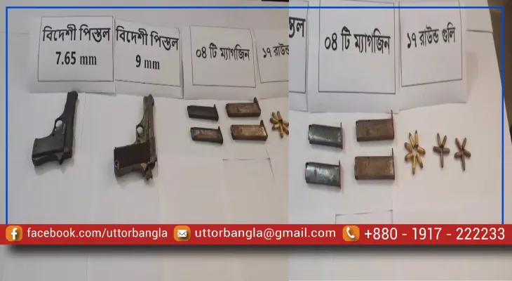 উদ্ধারকৃত অস্ত্রের মধ্যে রয়েছে—একটি ৭.৬৫ এমএম বোরের বিদেশি পিস্তল, দুটি ম্যাগজিনসহ ১০ রাউন্ড তাজা গুলি একটি ৯ এমএম বোরের বিদেশি পিস্তল, দুটি ম্যাগজিনসহ ৭ রাউন্ড তাজা গুলি।