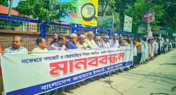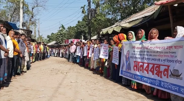 স্টাফ রিপোর্টার,নীলফামারী॥ নীলফামারীর ডোমার উপজেলার বোড়াগাড়ী ইউনিয়নে আওয়ামী লীগের ইউপি চেয়ারম্যান প্রার্থী পরিবর্তনের দাবিতে এলাকাবাসী রাস্তায় নেমেছে। আজ রবিবার (৫ ডিসেম্বর) দুপুরে ইউনিয়নটির প্রধান সড়ক জুড়ে মানববন্ধনের মাধ্যমে এলাকাবাসী ও দলীয় নেতাকর্মীরা ইউনিয়নের বর্তমান চেয়ারম্যান উপজেলা যুবলীগের আহবায়ক আমিনুল ইসলামকে পুনরায় দলীয় মনোনয়ন প্রদানের জোড় সুপারিশ করেছে। সেখানে শতশত নারীরাও অংশ নিয়েছে। মানববন্ধন চলাকালিন সেখানে বক্তব্য রাখেন বীরমুক্তিযোদ্ধা নুরুল আমিন, মৎসলীগের ইউনিয়ন সভাপতি হরিহর রায়, শিক্ষক আব্দুস সালাম, আজিমা বেগম, রহিমা বেগম। সরেজমিনে দেখা যায় ইউনিয়নের হাটবাজার থেকে কৃষক দিন মজুর সকলে এই মানববন্ধনে অংশ নিয়ে প্রধান মন্ত্রী শেখ হাসিনার নিকট প্রার্থী পরিবর্তনের জোড় দাবি জানান।