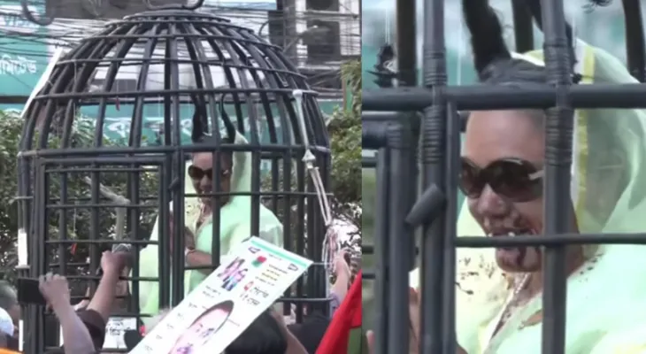 রাজধানীর এই শোভাযাত্রায় দেশের সাবেক প্রধানমন্ত্রী শেখ হাসিনাকে খাচার ভিতরে ভরে প্রদর্শন করছেন বিএনপির কর্মী সমর্থকরা। দেখা যাচ্ছে, টিয়া রঙের শাড়ি ও সাদা ব্লাউজ পরিয়ে তাকে নিয়ে আসা হয়েছে শোভাযাত্রায়। চোখে আছে কালো চশমা। দূর থেকে দেখলে অবিকল শেখ হাসিনা! এমন ভিন্ন প্রদর্শন দেখে র‌্যালিতে উপস্থিত নেতাকর্মীরা সেই খাঁচা ঘিরে উপহাস করছেন।