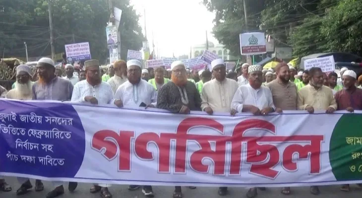 নিজস্ব প্রতিবেদক : জুলাই সনদের ভিত্তিতে ফেব্রুয়ারিতে নির্বাচনসহ পাঁচ দফা দাবিতে রংপুরে গণমিছিল করেছে বাংলাদেশ জামায়াতে ইসলামী। শুক্রবার দুপুরে জেলা ও মহানগর জামায়াতের উদ্যোগে নগরীর টাউন হল চত্বর থেকে বিক্ষোভ মিছিলটি শুরু হয়ে শহরের বিভিন্ন গুরুত্বপূর্ণ সড়ক প্রদক্ষিণ করে শাপলা চত্বরে গিয়ে শেষ হয়।