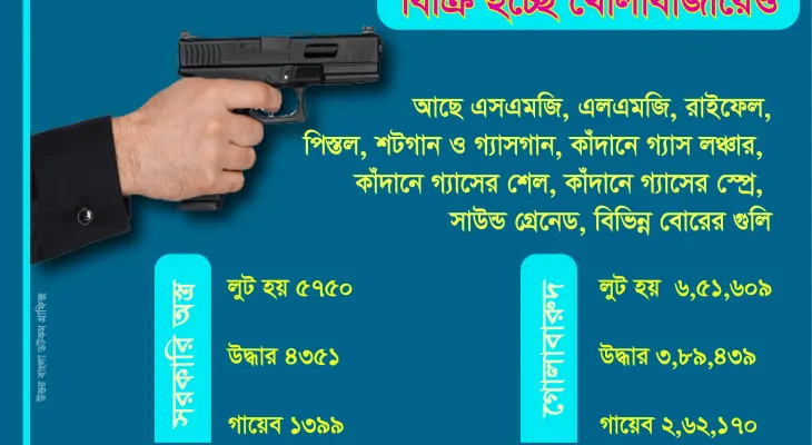 পুলিশ সদর দপ্তরের তথ্যানুযায়ী, ৫ আগস্টের পর দেশের বিভিন্ন থানা ও ফাঁড়ি থেকে মোট ৫ হাজার ৭৫০টি বিভিন্ন ধরনের অস্ত্র লুট হয়। এর মধ্যে উদ্ধার হয়েছে ৪ হাজার ৩৫১টি অস্ত্র। এ ছাড়া একই সময়ে গোলাবারুদ লুট হয় ৬ লাখ ৫১ হাজার ৬০৯টি। উদ্ধার হয়েছে ৩ লাখ ৮৯ হাজার ৪৩৯টি। এই হিসাবে এখন অস্ত্র উদ্ধার হয়নি ১ হাজার ৩৯৯টি। আর গোলাবারুদ উদ্ধার হয়নি ২ লাখ ৬২ হাজার ১৭০টি। আর লুট হওয়া অস্ত্রের মধ্যে রয়েছে এসএমজি, এলএমজি, বিভিন্ন ধরনের রাইফেল, পিস্তল, শটগান ও গ্যাসগান। এ ছাড়াও রয়েছে কাঁদানে গ্যাস লঞ্চার, কাঁদানে গ্যাসের শেল, কাঁদানে গ্যাসের স্প্রে, সাউন্ড গ্রেনেড, বিভিন্ন বোরের গুলি।