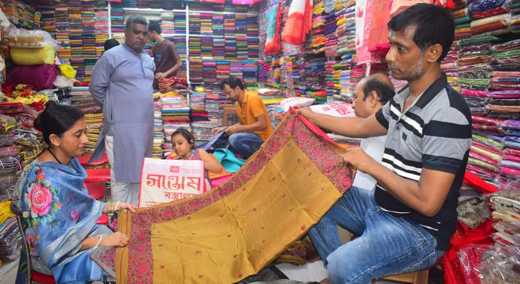 এদিকে ধানমন্ডি হকার্স, চাঁদনী চক ও গাউছিয়ার বেশিরভাগ শাড়ি দোকানদার ক্রেতাদের সময় দিতে ব্যস্ত সময় পার করছেন।