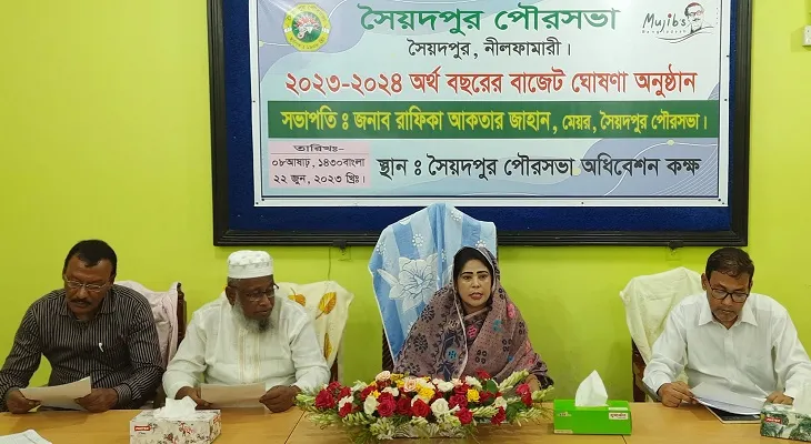 স্টাফরিপোর্টার,নীলফামারী॥ নীলফামারীর সৈয়দপুর পৌরসভার ২০২৩- ২০২৪ইং অর্থবছরের জন্য ১৫৯ কোটি ৭৫ লাখ ৪৫ হাজার ৫৯৮ টাকার বাজেট ঘোষণা করা হয়েছে। বৃহ¯পতিবার (২২ জুন) বিকালে পৌরসভার সম্মেলন কে এক অনুষ্ঠানে ওই বাজেট ঘোষনা করা হয়। প্রথম শ্রেণির সৈয়দপুর পৌরসভার মেয়র রাফিকা আকতার জাহান বাজেট ঘোষণা অনুষ্ঠানে সভাপতিত্ব ও বাজেট উপস্থাপন করেন।