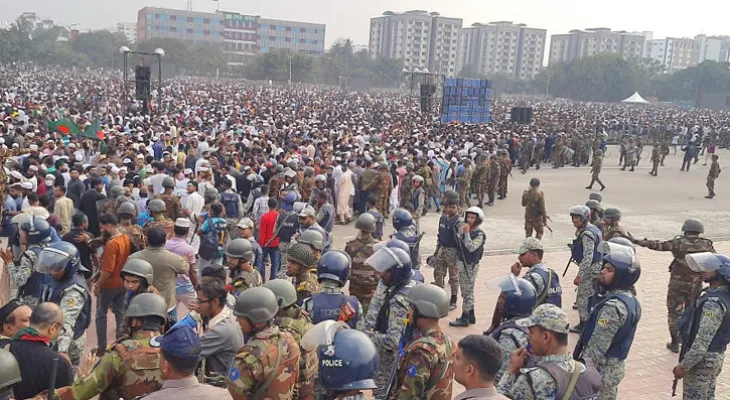নিউজ ডেস্ক: জুলাই বিপ্লবী ও আধিপত্যবাদবিরোধী ‘ইনকিলাব মঞ্চ’র মুখপাত্র শরিফ ওসমান বিন হাদির জানাজা শেষে সেখানে উপস্থিত একদল লোক সংসদ ভবনে প্রবেশের চেষ্টা করেছে। তবে সেখানে অবস্থানরত সেনা সদস্যরা তাদের বাধা দেন এবং সংসদের ভেতরে প্রবেশের গেটগুলোর সামনে অবস্থান নেন।