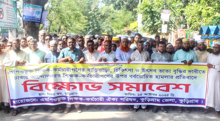 কুড়িগ্রাম প্রতিনিধি: কুড়িগ্রামে এমপিওভুক্ত শিক্ষক-কর্মচারীদের বাড়িভাড়া, চিকিৎসা ও উৎসব ভাতা বৃদ্ধির দাবিতে এবং ঢাকায় আন্দোলনরত শিক্ষক-কর্মচারীদের ওপর বর্বরোচিত হামলার প্রতিবাদে বিক্ষোভ সমাবেশ অনুষ্ঠিত হয়েছে।
