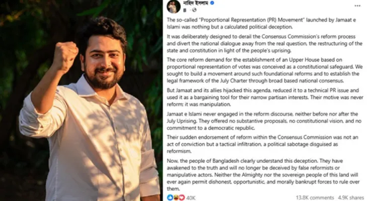 নিউজ ডেস্ক: বাংলাদেশ জামায়াতে ইসলামীর সংখ্যানুপাতিক নির্বাচন নিয়ে আন্দোলনকে ‘সুপরিকল্পিত প্রতারণা’ হিসেবে উল্লেখ করেছেন জাতীয় নাগরিক পার্টির (এনসিপি) আহ্বায়ক নাহিদ ইসলাম। এ ঘটনার পর সামাজিক যোগাযোগমাধ্যম ফেসবুকে তার পোস্ট নিয়ে তুমুল প্রতিক্রিয়া দেখা যাচ্ছে।