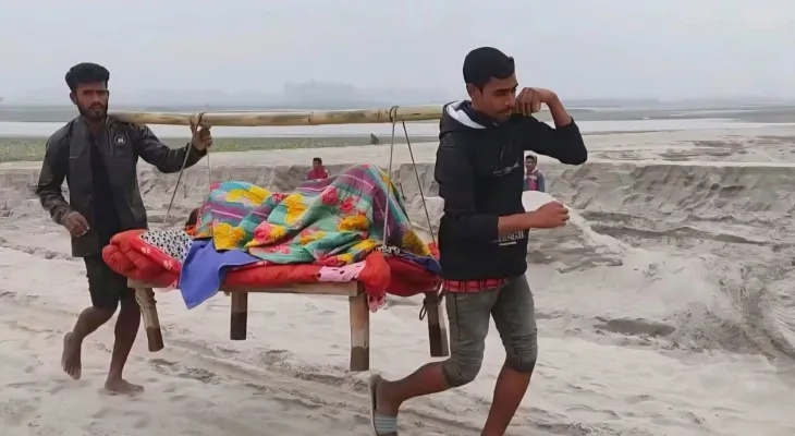 ​স্থানীয় সূত্রে জানা যায়, তিস্তা চরের বাসিন্দা এক বৃদ্ধা মধ্যরাতে হঠাৎ গুরুতর অসুস্থ হয়ে পড়েন। চরাঞ্চলে দ্রুত চিকিৎসার কোনো ব্যবস্থা না থাকায় এবং হাসপাতাল বহুদূরে হওয়ায় দুই ছেলে নিরুপায় হয়ে নিজেদের কাঁধকেই অ্যাম্বুলেন্স বানিয়ে নেন। বালুচর উপেক্ষা করে হাসপাতাল পৌঁছানোর জন্য ভোরের আলো ফোটার সঙ্গে সঙ্গেই তারা প্রায় কিলোমিটারের পর কিলোমিটার পথ মাকে কাঁধে করে পাড়ি দিতে শুরু করেন। নদী আর বালুচরের এই রুক্ষ পথে সন্তানেরা মায়ের জীবন বাঁচাতে যে রুদ্ধশ্বাস দৌড় শুরু করেন, তা মুহূর্তে স্থানীয়দের চোখে এনেছে জল।