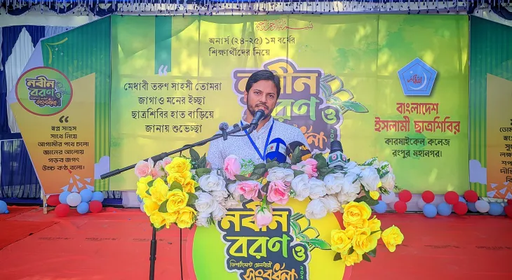 সোমবার (২৭ অক্টোবর) সকালে রংপুরের ঐতিহ্যবাহী কারমাইকেল কলেজের শহীদ মিনার প্রাঙ্গণে বাংলাদেশ ইসলামী ছাত্রশিবির রংপুর মহানগর শাখার আয়োজনে নবীনবরণ ও ডিপার্টমেন্ট প্লেসধারী সংবর্ধনা অনুষ্ঠানে প্রধান অতিথির বক্তব্য শেষে সাংবাদিকদের সঙ্গে মতবিনিময়ের সময় তিনি এসব কথা বলেন।