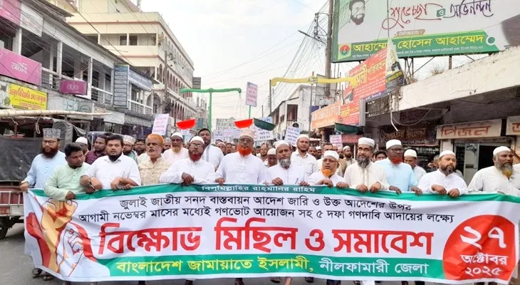 স্টাফরিপোর্টার,নীলফামারী॥ জুলাই জাতীয় সনদ বাস্তবায়নের আদেশ জারি ও নভেম্বরে গণভোট আয়োজনসহ ৫ দফা দাবিতে নীলফামারীতে বিক্ষোভ মিছিল ও সমাবেশ করেছে জেলা জামায়াতে ইসলামী। সোমবার (২৭ অক্টোবর) বিকাল ৫টায় জেলা শহরের বড় বাজার মোড় থেকে বিক্ষোভ মিছির বের হয়ে শহর প্রদক্ষিণ শেষে স্বাধীনতা স্মৃতি অম্লান চৌরঙ্গী মোড়ে গিয়ে সমাবেশ করে।