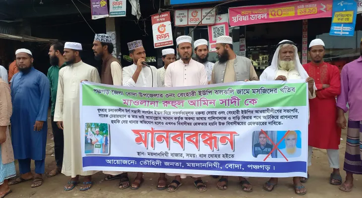 পঞ্চগড় প্রতিনিধি: পঞ্চগড়ের বোদা উপজেলার বেংহারী ইউনিয়নের ঝলঝলি জামে মসজিদে জুম্মার নামাজের খুৎবাহয় সতর্কতামূলক বয়ান দেয়াকে কেন্দ্র করে মসজিদের খতিব মাওলানা রুহুল আমিন সাদীকে লাঞ্চিত সহ প্রাণনাশের হুমকি দেওয়ার অভিযোগে মানববন্ধন করেছে মুসল্লিরা।