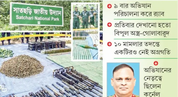 নিউজ ডেস্ক:  ক্ষমতাচ্যুত প্রধানমন্ত্রী শেখ হাসিনার শাসন আমলে হবিগঞ্জের সাতছড়ি জাতীয় উদ্যানে বারবার মঞ্চস্থ হয়েছিল অস্ত্র উদ্ধার নাটক। ভারতের ত্রিপুরা সীমান্তসংলগ্ন চুনারুঘাটে ২৪৩ হেক্টরের এ বনে র‌্যাবের উদ্যোগে মোট ৯ দফা অভিযান চালানো হয়। দেশে যখনই রাজনৈতিক অস্থিরতা তৈরি হতো, তখনই জনগণের দৃষ্টি ভিন্ন খাতে নিতে সাজানো হতো অস্ত্র উদ্ধারের ঘটনা। উদ্ধার দেখানো হতো ভারী অস্ত্র ও গোলাবারুদ। এগুলো ঠিক কোথা থেকে, কী উদ্দেশ্যে, কারা এনেছিলেন—এসব প্রশ্নের উত্তর মেলেনি আজও। উদ্ধার দেখানো পর্যন্তই সীমাবদ্ধ। এসব ঘটনায় চুনারুঘাট থানায় অন্তত ১০টি মামলা করা হলেও একটিরও রহস্য উদঘাটন হয়নি। এতেই জনমনে প্রশ্ন উঠেছে, তবে কি এ উদ্যান থেকে অস্ত্র উদ্ধার ছিল আওয়ামী সরকারের পরিকল্পিত নাটক?