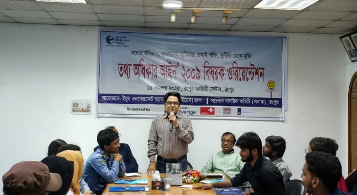 রংপুর রোটারী সেন্টারে অনুষ্ঠিত ওরিয়েন্টেশনের উদ্বোধন করেন সনাক সদস্য মো: জাহাঙ্গীর আলম। তরুণদের মাঝে তথ্য অধিকার আইন বিষয়ক ধারণা প্রদান ও হাতে কলমে আবেদনের প্রক্রিয়া সম্পর্কে সচেতন করার লক্ষ্যে রংপুরের বিভিন্ন স্বেচ্ছাসেবী সংগঠনের তরুণ প্রতিনিধিদের এবং তাদের মাধ্যমে সাধারণ জনগণকে আইনটি সম্পর্কে সচেতন করাই ছিল এ ওরিয়েন্টেশনের মূল উদ্দেশ্য। টিআইবি-রংপুরের এরিয়া কোঅর্ডিনেটর মো: আলমগীর কবির ওরিয়েন্টেশন সেশন পরিচালনা করেন।