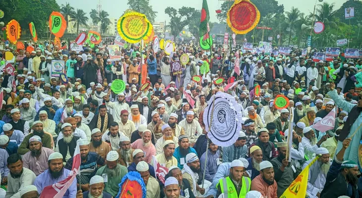 জুলাই সনদ বাস্তবায়ন, নির্বাচনের আগে গণভোট আয়োজনসহ পাঁচ দফা দাবিতে রংপুরে জামায়াতে ইসলামীসহ ৮ সমমনা দলের অনুষ্ঠিত বিভাগীয় সমাবেশ শুরু পবিত্র কোরআন তেলাওয়াতের মাধ্যমে। পরে স্থানীয় নেতৃবৃন্দের বক্তব্যের পর জামায়াতে ইসলামীর নায়েবে আমির ও সাবেক সংসদ সদস্য অধ্যাপক মুজিবুর রহমানের সভাপতিত্বে সমাবেশে বক্তব্য দেন বাংলাদেশ খেলাফত মজলিসের সিনিয়র নায়েবে আমির মাওলানা ইউসুফ আশরাফ, খেলাফত মজলিসের নায়েবে আমির আহমদ আলী কাসেমী, বাংলাদেশ নেজামে ইসলাম পার্টির সিনিয়র নায়েবে আমির মাওলানা আব্দুল মাজেদ আতহারী, বাংলাদেশ খেলাফত আন্দোলনের নায়েবে আমির মাওলানা মুজিবুর রহমান হামিদী, জাতীয় গণতান্ত্রিক পার্টির সহ-সভাপতি ও মুখপাত্র রাশেদ প্রধান এবং বাংলাদেশ ডেভেলপমেন্ট পার্টির চেয়ারম্যান অ্যাডভোকেট আনোয়ারুল ইসলাম।