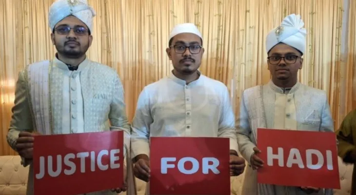 ডাকসুর নেতা এবি জুবায়ের সামাজিক যোগাযোগমাধ্যমে একাধিক ছবি পোস্ট করেন, যেখানে দেখা যায় বরের সাজে ফরহাদ ও মহিউদ্দীন ‘জাস্টিস ফর হাদি’ লেখা প্ল্যাকার্ড হাতে দাঁড়িয়ে আছেন। এছাড়াও ছবি তাদের সঙ্গে প্ল্যাকার্ড হাতে ডাকসুর ভিপি সাদিক কায়েমকেও দেখা গেছে।