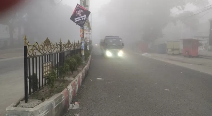 এদিকে প্রচণ্ড শীত, সঙ্গে ঘন কুয়াশার কারণে হেড লাইট জ্বালিয়ে যানবাহন চলাচল করতে বাধ্য হচ্ছে।