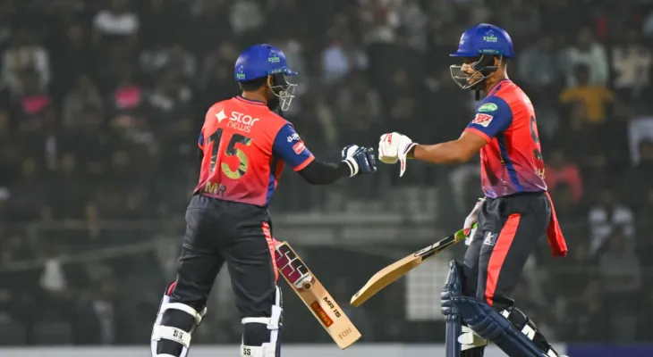 নিউজ ডেস্ক: নাজমুল হোসেন শান্তর শুরুটা ছিল ধীরগতির। প্রথম ৮ বলে ২ রান তোলেন। ষষ্ঠ ওভারে সাইম আইয়ুবকে টানা তিনটি চার মেরে শুরু। একই ছন্দে খেলে গেলেন শেষ পর্যন্ত। ইনিংসের শেষ ওভারে হজরতউল্লাহ জাজাইয়ের মিস ফিল্ডিংয়ে ডাবলসে সেঞ্চুরি হয়ে যায় তার। অন্য প্রান্তে মুশফিকুর রহিমও ব্যাট হাতে সাবলীল। দুজনের একশ ছাড়ানো জুটিতে দুই বল বাকি থাকতে ৮ উইকেটে সিলেট টাইটান্সকে হারিয়েছে রাজশাহী ওয়ারিয়র্স।